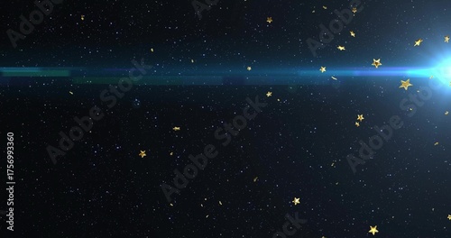 Naklejka premium Emitting bluish lens flare in outer space with drifting golden star shapes,...