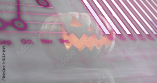 © vectorfusionart, Obraz premium Emitting warm light, carved jack o lantern glowing on glossy surface in studio, with pink charts