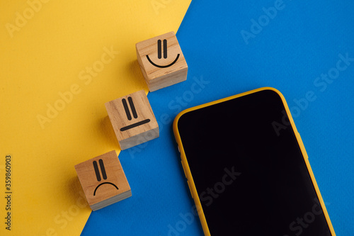 Obraz premium Emotion face symbol on wooden cube blocks and smartphone. Service rating,...