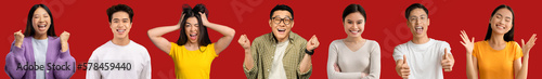 © Prostock-studio, Obraz premium Emotional asian men and women posing on red, collage