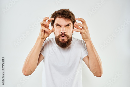 Naklejka premium Emotional bearded man in a white t-shirt gestures with his hands light background