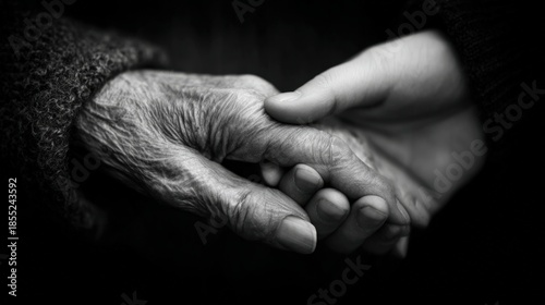 Fototapeta premium Emotional Black-and-White Photo of Caregiver Holding Elderly Hand