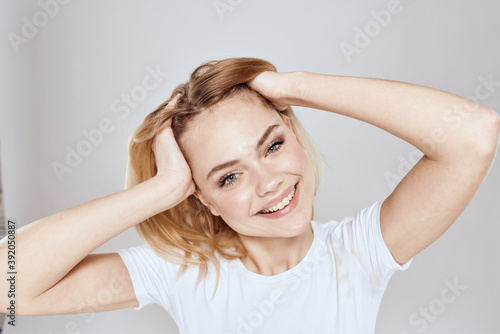 Naklejka premium emotional blonde white t-shirt close-up studio lifestyle fun