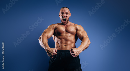 Fototapeta premium Emotional bodybuilder screaming and showing muscles on blue background. Fit man with muscular body