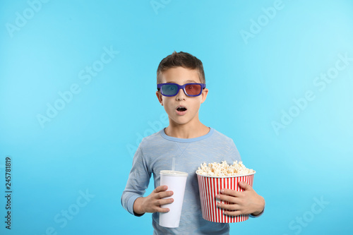 Fototapeta premium Emotional boy with 3D glasses, popcorn and beverage during cinema show on color background