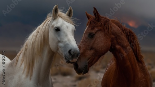 © Anastasiya Ri, Fototapeta premium Emotional close-up of two horses standing face to face under stormy skies on an open plain perfect for themes of connection, animal bonding and emotional equine portraits