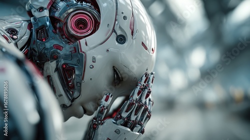 © suus, Fototapeta premium Emotional humanoid robot contemplates existence in a futuristic world