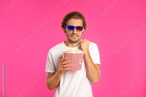 Fototapeta premium Emotional man with 3D glasses and popcorn during cinema show on color background