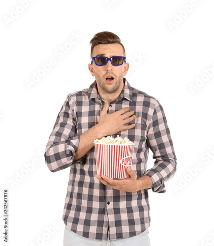 Naklejka premium Emotional man with 3D glasses and popcorn during cinema show on white background