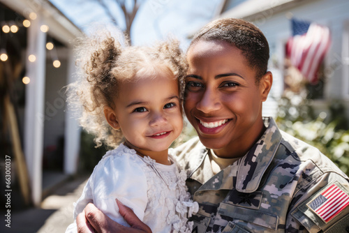 © Garnar, Obraz premium Emotional military homecoming. Portrait of a happy female soldier hugging daughter after returning home from the army. African american military servicewomen reuniting with family after serving
