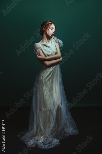 © Kateryna, Fototapeta premium Emotional old-fashioned portrait of a girl in retro style in a light transparent dress with shiny elements on the shoulders.