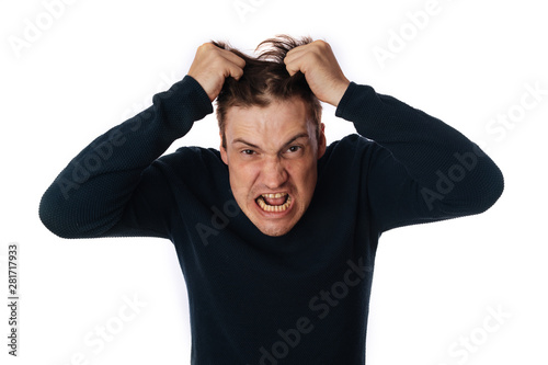 © Anton Dios, Fototapeta premium emotional portrait of a crazy man in close-up. concept: the nervous breakdown, mental disease, headaches and migraine. isolated on white background.