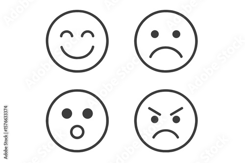 © Oliver, Fototapeta premium Emotional spectrum emoji icons, set of 4 round line vector symbols: happy, sad, surprised, angry emoticon faces, social media reaction illustration
