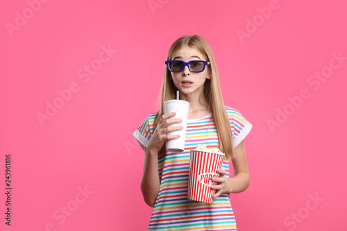 Fototapeta premium Emotional teenage girl with 3D glasses, popcorn and beverage during cinema show on color background