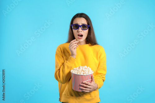 Fototapeta premium Emotional woman with 3D glasses and popcorn during cinema show on color background