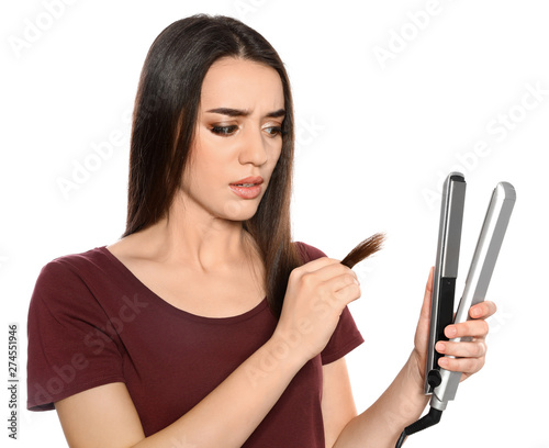 Obraz premium Emotional woman with hair iron on white background