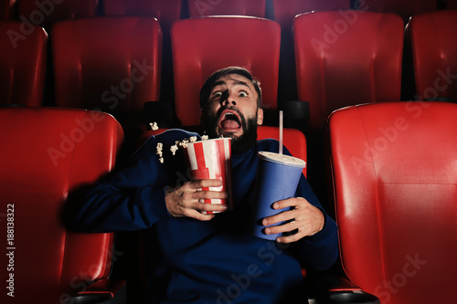 © Africa Studio, Naklejka premium Emotional young man watching movie in cinema