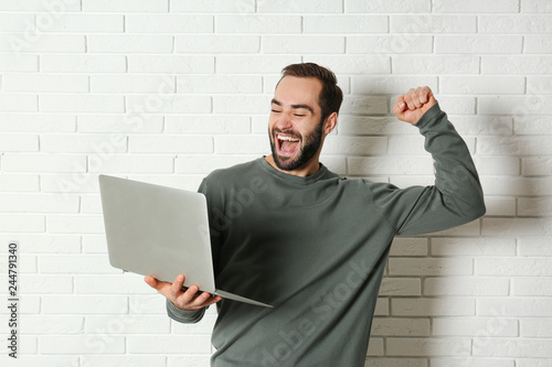 Fototapeta premium Emotional young man with laptop celebrating victory near brick wall