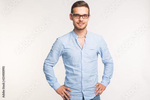 Fototapeta premium Emotions and people concept - handsome man standing and smiling over the white background