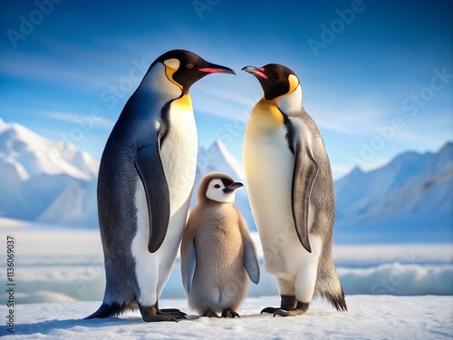 © chaowalit, Fototapeta premium Emperor Penguin Family on Snowy Plain - Heartwarming Nature Scene