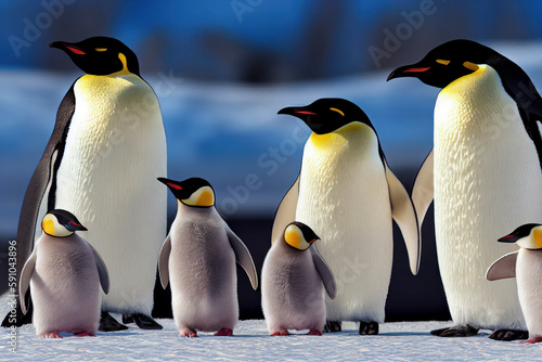 Fototapeta premium Emperor Penguin family with a fluffy baby, in snowy Antarctic, generative ai