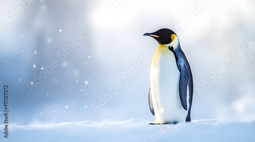 Fototapeta premium Emperor penguin standing majestic in bright Arctic landscape, pristine snow-covered ground, soft diffused sunlight, crystal clear air, light snowfall, pale blue sky.