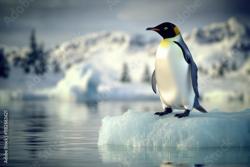 Naklejka premium Emperor penguin standing on an ice floe in a serene Antarctic landscape...