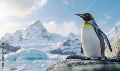 Fototapeta premium Emperor penguin standing on icy rock with Antarctic landscape in background