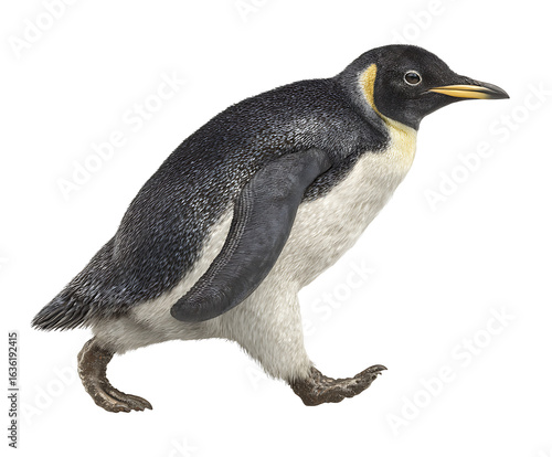 © Stock4u2024 , Naklejka premium Emperor Penguin Strolling Forward: A majestic emperor penguin confidently strides forward, its sleek, streamlined body and unique coloration contrasting beautifully.