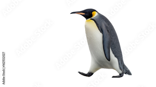 © Suborna, Fototapeta premium Emperor penguin walking sideways on ice with wet feather details and natural cold light, real look, full view, on white background, 4k, unique, no blur, clear view