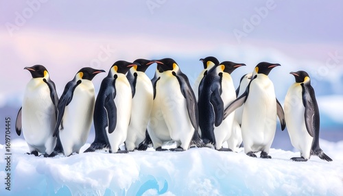 Obraz premium Emperor penguins huddle on an icy landscape