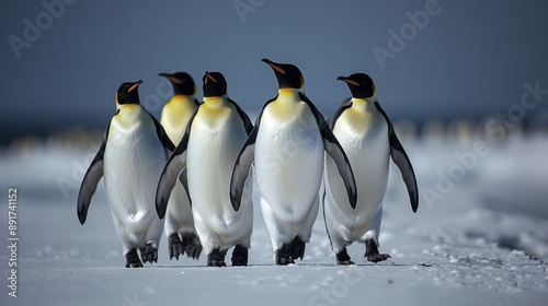 Naklejka premium Emperor Penguins Marching on Snowy Beach