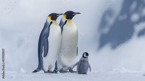 © Luminous Hub , Fototapeta premium Emperor Penguins Waddling Together with Chicks in Antarctica