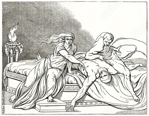 Obraz premium Emperor's Claudius death on his bed probably poisoned by Agrippina. Ancient grey tone etching style art by Guemied, Andrew, Best and leloir, Magasin Pittoresque, 1838