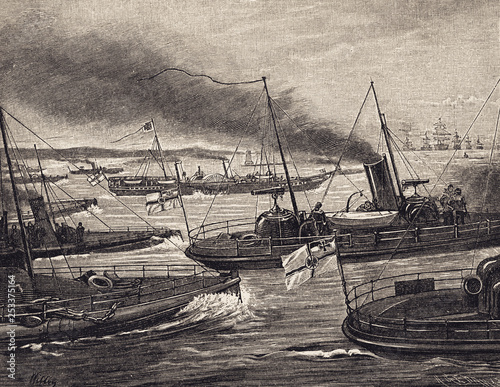 Fototapeta premium Emperor Wilhelm II. Journey to visit the Russian tsar: S. M. yacht 'Hohenzollern' and the accompanying torpedo boats. - Illustration, Germany, 1880-1889, 19th Century, 19th Century Style, Adventure