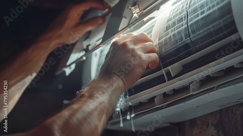 © pkproject, Obraz premium Emphasizing Regular Maintenance: Hands Removing a Clogged Air Filter from a Residential AC Unit