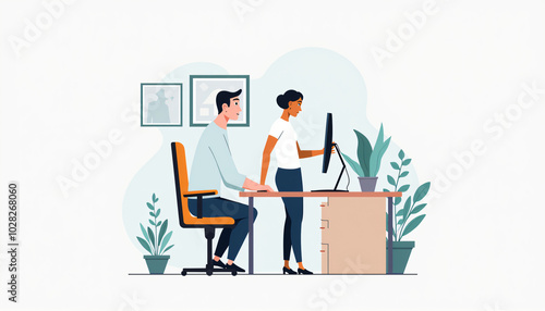 © YoungMok, Obraz premium Employee at desk talking to a colleague