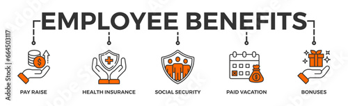 © aditia, Naklejka premium Employee benefits banner web icon vector illustration concept with icon of pay raise, health insurance, social security, paid vacation and bonuses