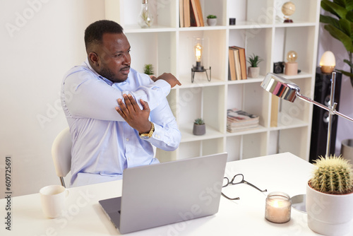 © st.kolesnikov, Obraz premium Employee Stretching At Office Desk At Work, tired African American office worker
