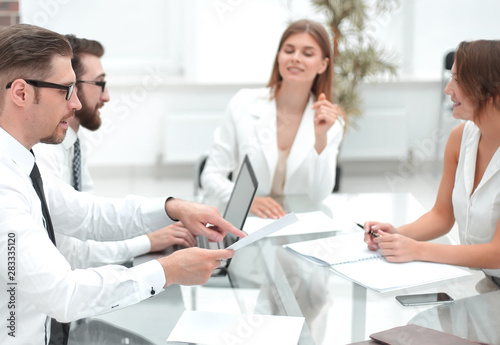 Fototapeta premium employees discussing business documents.