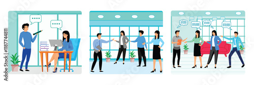 Fototapeta premium Employees standing and sitting. Office Team Engaged in Discussion. Empty speech bubbles. Set flat vector modern illustration