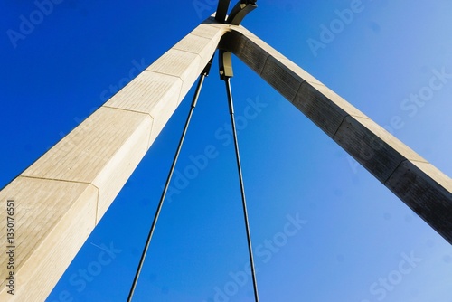 © Anette, Naklejka premium Emporragender Brückenpfeiler aus Beton mit Kabelseil vor blauem Himmel bei Sonne am Nachmittag im Sommer