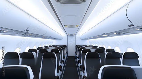 Fototapeta premium Empty airplane cabin with rows of black and white seats.