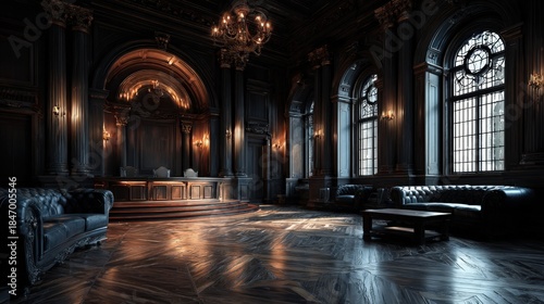 Fototapeta premium Empty american style courtroom with judge's bench and tables before civil...