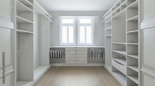 Obraz premium Empty and open closet in a minimalist style room, highlighting the smooth surfaces and geometric simplicity