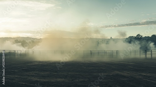 © Pixelzone, Obraz premium Empty arena large amount smoke rising from ground desolate rodeo