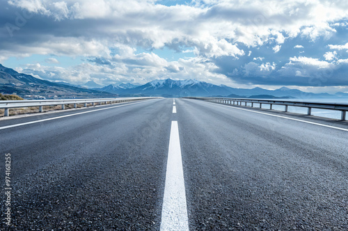 Fototapeta premium Empty asphalt highway leading to snowy mountains