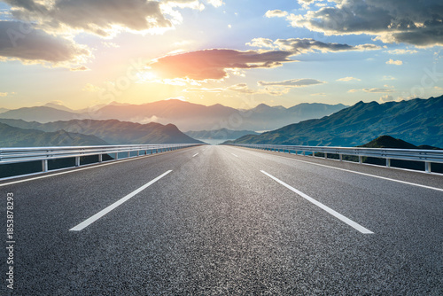 © ABCDstock, Fototapeta premium Empty asphalt highway road leading towards the distant mountain range at sunset