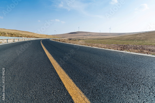 Fototapeta premium Empty asphalt highway road surrounded by fields with windmills