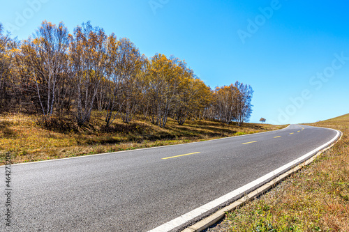 © ABCDstock, Fototapeta premium Empty asphalt road and autumn forest landscape.Road and trees background.